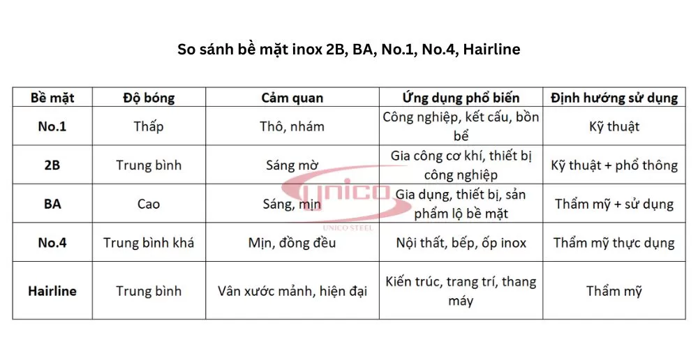Mỗi loại bề mặt inox có đặc điểm khác nhau về độ bóng, độ nhám, quy trình hoàn thiện và phạm vi ứng dụng. Không có loại nào “tốt nhất” theo nghĩa tuyệt đối. Điều quan trọng là chọn đúng loại theo yêu cầu thực tế I Unicosteel